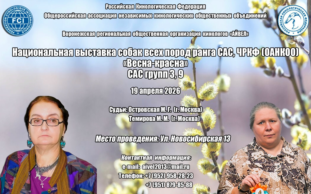 19 апреля 2026 года наш клуб проведет Выставку собак всех пород ранга САС- ЧРКФ, эксперт РКФ-ФЦИ - Островская М.Г.(г.Москва)